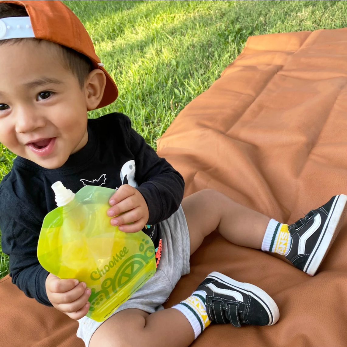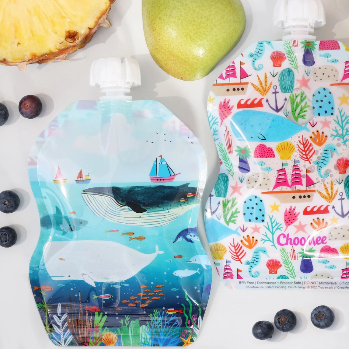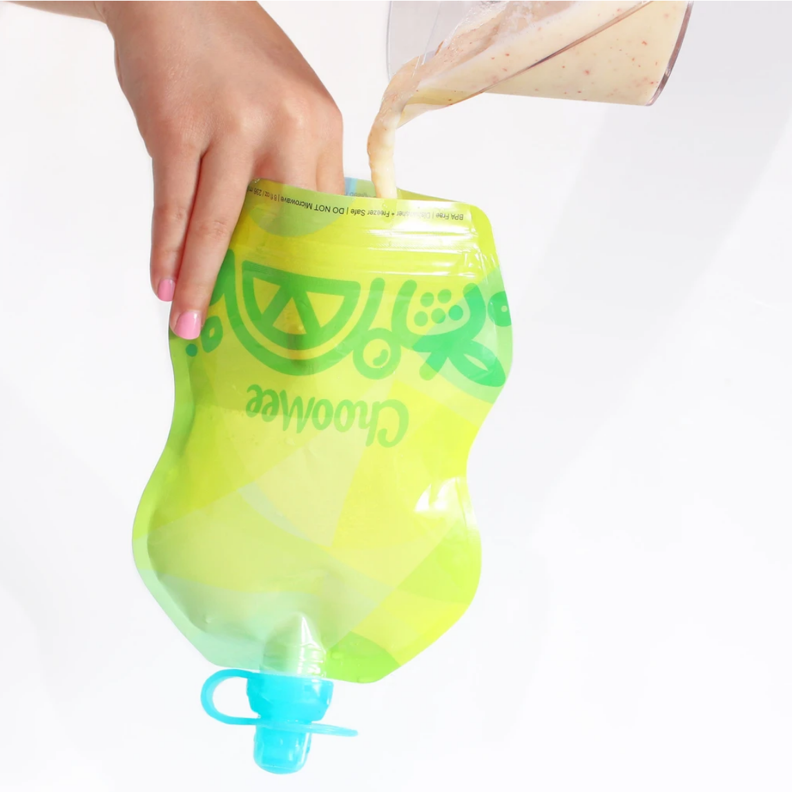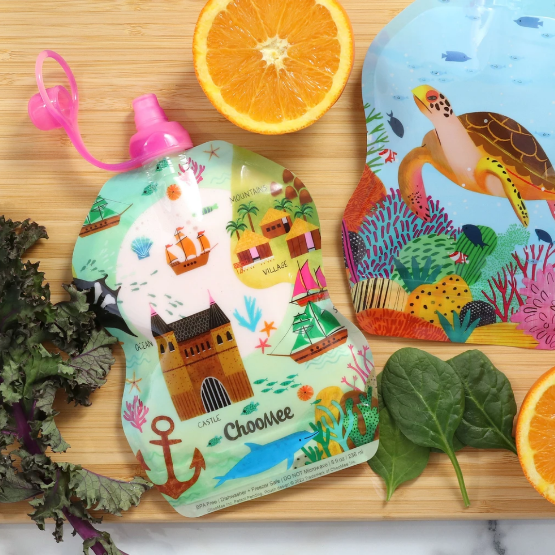 ChooMee proudly introduces its SnakPack TropiColor Reusable pouch set. Now your child and family can enjoy their favorite fresh and healthy snacks whether around the house or on the go with our large 8 oz food pouch. Let's Get Fresh and fill with your favorite homemade baby food, smoothie, puree, apple sauce or yogurt to make feeding time a breeze. Pair with our SoftSip pouch toppers (sold separately) and maximize your pouch performance with our 100% all silicone flow control valve that prevents spills and protects their mouth.