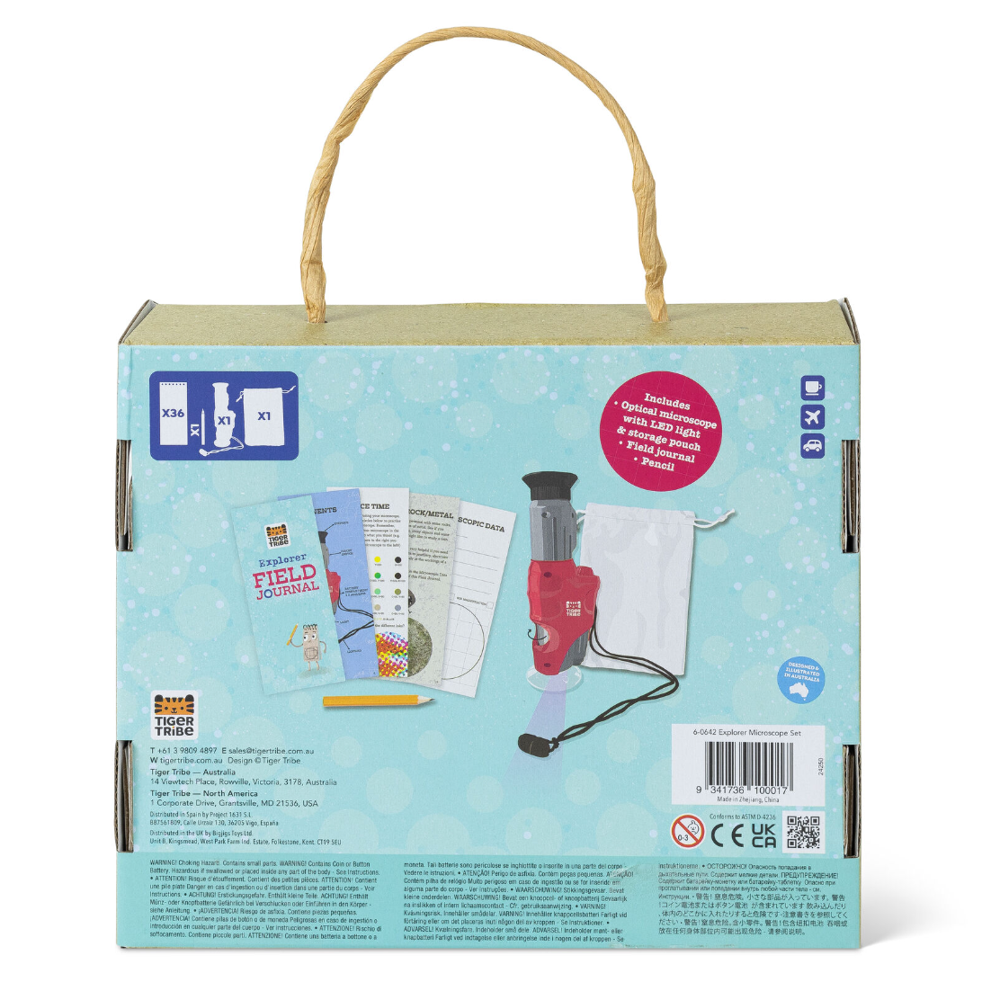 - Includes 1 x lightweight portable optical microscope with LED light, 1x drawstring storage pouch, 1x Explorer Field Journal (spiral bound, 36 pages) & HB pencil