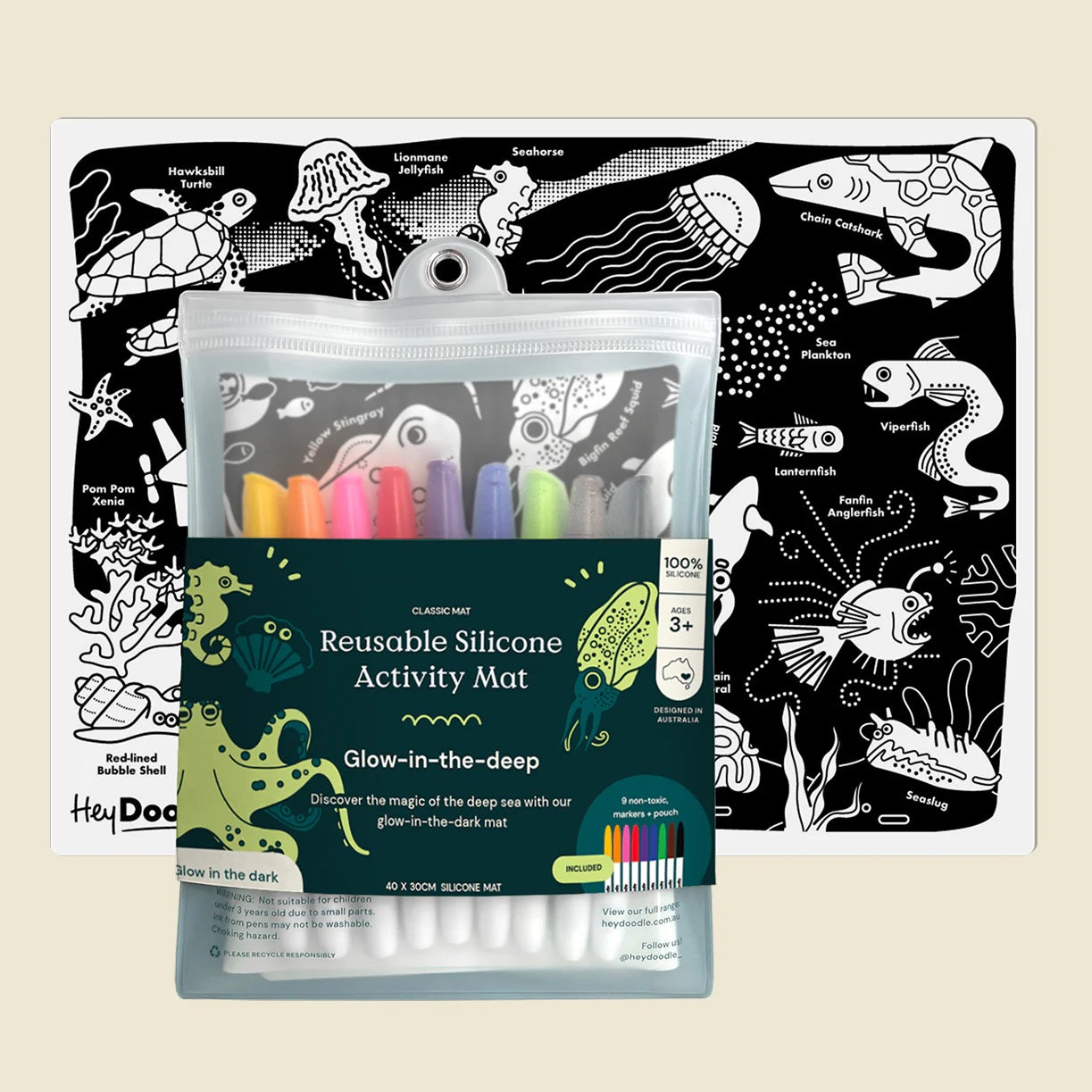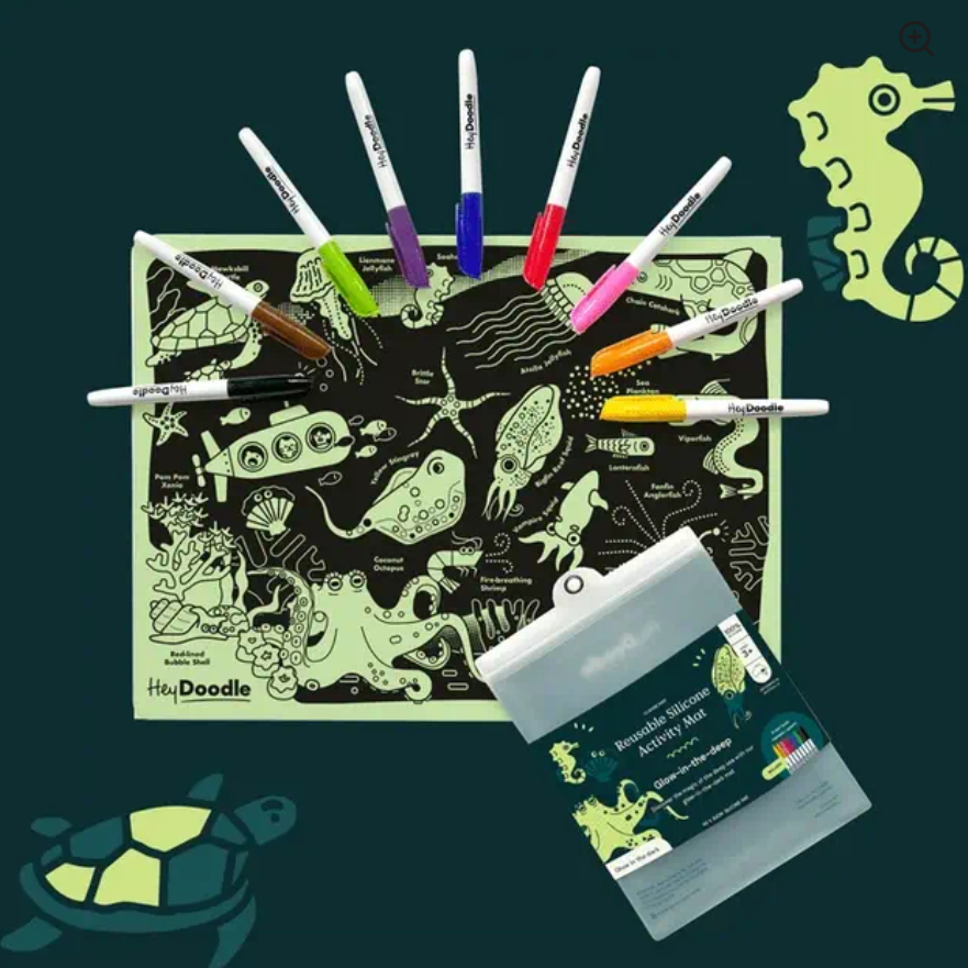 Sail into the deep and discover a glowing underwater world with the Glow-in-the-Deep mat from HeyDoodle’s Classic range!